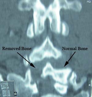 The spine model shown is exactly reconstructed from the CT scan shown below, after a Florida surgeon performed an operation drilling out and removing completely the wall of bone from the left side of the spine in this spot. The upper joint and surface of the joint was also completely removed.