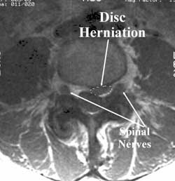 The loss of water weakens the disc and decreases its “shock absorber” capabilities. In this case, a fragment of the central part of the disc has slipped backwards and upwards, to narrow the spinal canal
