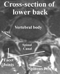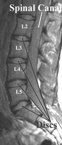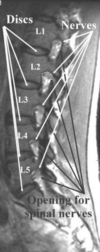 At L2 (the 2nd lumbar vertebra), the spinal nerve is circled with a white line. The bright material below the nerve is fatty tissue.