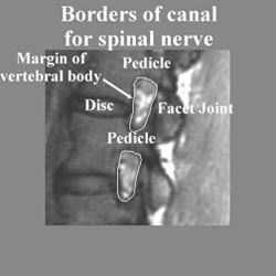 This neural foramen can be narrowed by disc herniations, spurs from the margin of the vertebral body, or spurs from the facet joints