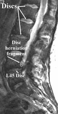 In this patient, a fragment of the L4-5 disc has extruded outside its normal location and is pushing into the spinal canal.