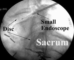 During minimally invasive surgery for disc herniation, a small endoscope with fiber optics is directed from the skin to the disc.