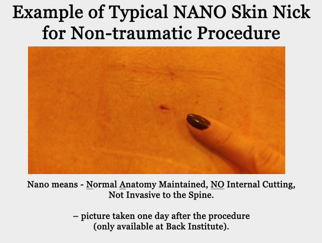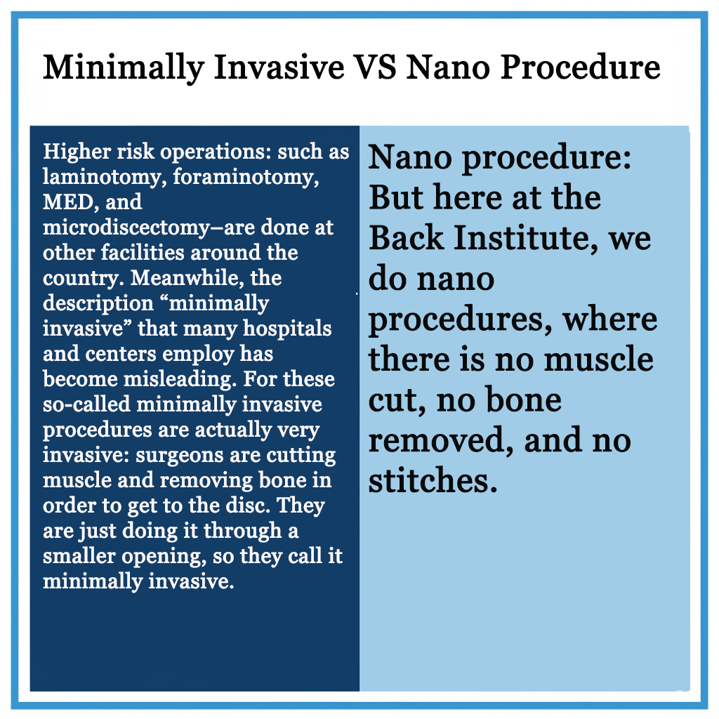 They are simply not able to do a zero access damage procedure. They do not have the correct technology available to them and they have no experience with the use of this technology. Many surgeons around the country, even at the biggest centers, claim to do minimally invasive spine surgery, when, in reality, they are performing surgery that, by comparison, is actually old fashioned traumatic spine surgery. The advancements in proprietary equipment and totally nano techniques that the Back Institute has made in the last 20 years make us the unique leader in performing Nano Spine Procedures. It is a source of confusion that the words “minimally invasive” have lost their original meaning. Today, many surgeons around the country are still missing the real point of what “minimally invasive,” should be, which is not to cut muscle, not to remove bone, not to cause scarring, and not to alter the normal anatomy of the spine in order to get to the problem disc area. In fact, “minimally invasive” is not specific, clear or understandable language at all, but “zero damage in getting to the problem” is clear. As spine centers around the country rely on clever marketing and catchy words like “laser” to attract patients, they continue to lack the experience, expertise, credentials and technology to do a truly Nano Procedure. In fact, a laser is rarely needed in any of these procedures, whether done at the Back Institute or elsewhere. |